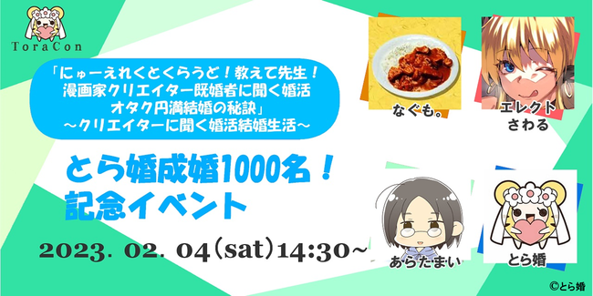 アニメや漫画・ゲームなど趣味を愛するオタク層向けに特化した結婚相談サービス「とら婚」は、現役の漫画家をゲストに招き、成婚数1,000名突破記念の「クリエイター既婚者に聞く婚活トークイベント」を、2023年2月4日(土)に開催いたします。