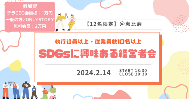 審査制・決裁者マッチングプラットフォーム「ONLY STORY」「チラCEO」(サービスサイト:https://onlystory.co.jp/service/ )を運営する株式会社オンリーストーリー(代表取締役:平野哲也、本社:東京都渋谷区)は、2月14日(水)18:30に決裁者向け・BAR貸切イベント「SDGsに興味ある経営者会」を開催いたします。