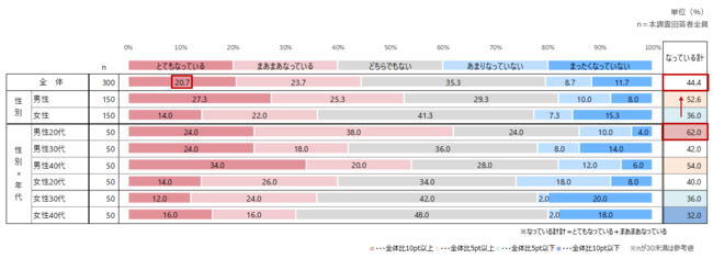 性別でみると、『男性』は『女性』よりも「なっている計」が上回っており、なかでも『男性20代』が特に高い。