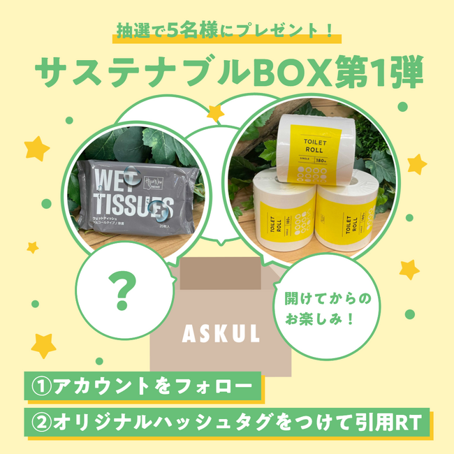 アスクルは6月14日より、ASKUL公式Twitterにおいて、環境月間に合わせたキャンペーン企画「もらうだけで地球に貢献!サステナブルBOXプレゼント第1弾」を7日間限定で開始します。本キャンペーンでは、わけありのオリジナル商品(※1)をセットにし、抽選で5名様にプレゼントします。応募の際は、アスクル公式Twitterアカウントのフォローとキャンペーン投稿をオリジナルハッシュタグをつけて引用リツイートが必須(※2)となりますので、どうぞお見逃しなく!