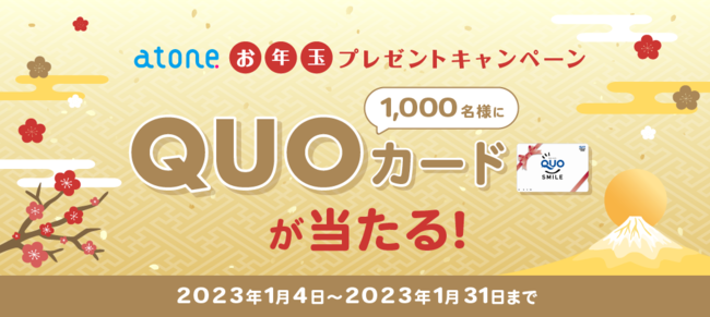 本キャンペーンにエントリーの上、期間内にネットショップでatoneを利用して合計500円以上お買い物いただくと、QUOカード1,000円券を1,000名様にプレゼントいたします。