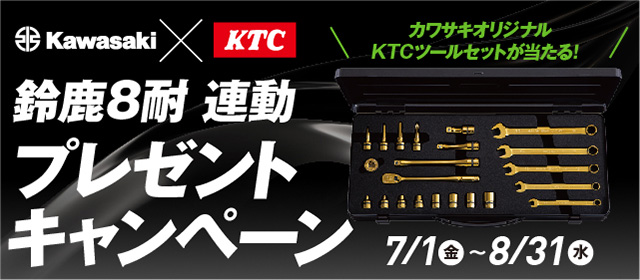 株式会社カワサキモータースジャパン(本社:兵庫県明石市、代表取締役社長:桐野 英子)は、期間中応募いただいた中から抽選でKTCネプロスゴールド工具セット(Kawasakiロゴ入り)が当たる「カワサキ×KTC 鈴鹿8耐連動プレゼントキャンペーン」を7月1日(金)より開催いたします。