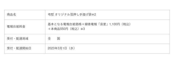 NTT西日本は、新たに弔慰用電報台紙「弔慰 オリジナル箔押し手提げ袋」(以下、本商品)を2023年3月1日(水)より全国※1で販売開始します。