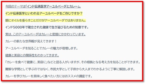 『インド伝承医学アーユルベーダとカレー~日本流アーユルベーダカレーのおススメ』講座とは!