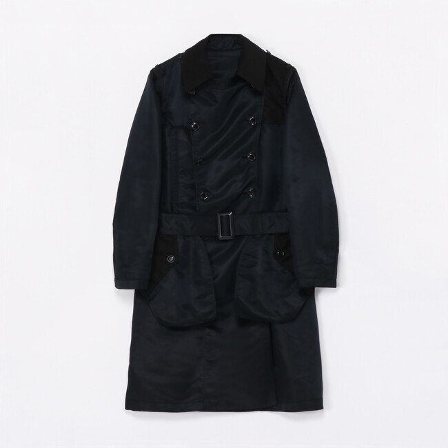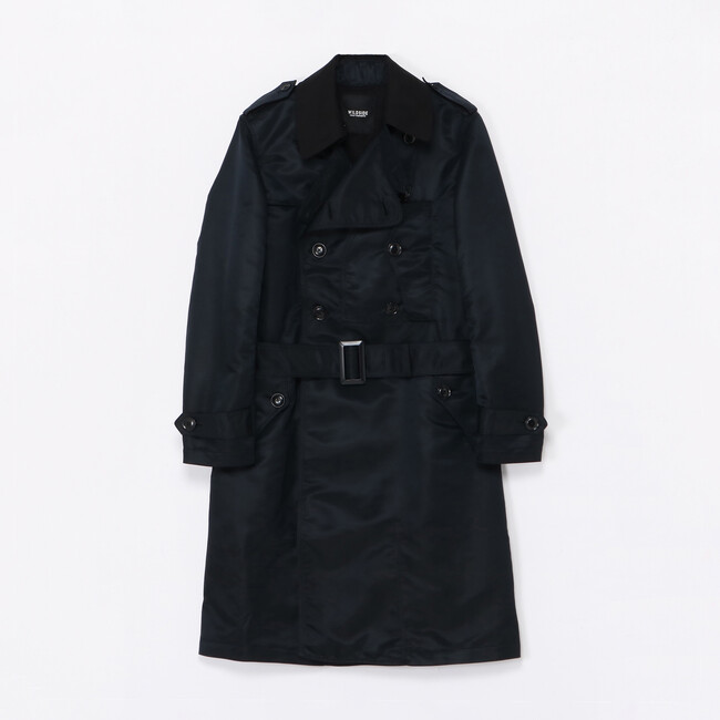 敢えてMA-1などに使用されるナイロン素材で作られたミリタリーテイストなトレンチコートは、ナイロンならではの縫い目のシワ感や光沢が特徴的。リバーシブル仕様になっており、裏返すとポケットやブランドタグが表に出るインサイドアウトのデザインで、裏返した状態でもポケットが使用可能な拘りのポケットを擁しています。