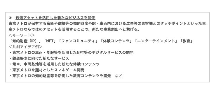 ・新規事業創出プログラム(テーマ1.~5.) https://eiicon.net/about/tokyometro2022/