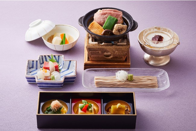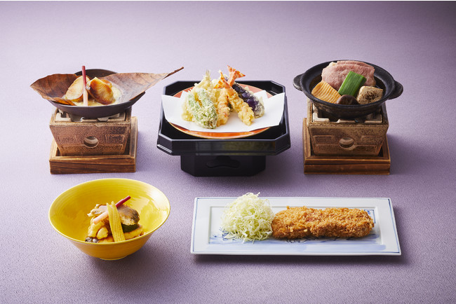 「源氏香」では、お好みのメインとお食事を組み合わせて楽しむ会席料理をこの夏もご提供します。前菜、御椀、お造り、焚合せに加え、メインは人気の銀鱈西京焼き、肉の旨みを堪能できるTOKYO X ロースカツ、職人技で仕上げる天婦羅など5種から、お食事も夏らしく、冷やしそばなど4種からお選びいただけます。