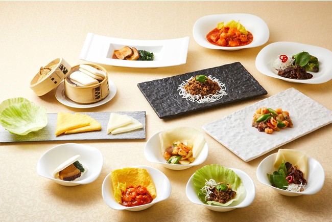 王道の蒸しパンで包む“もち豚の角煮”をはじめ、ヤングコーンやアスパラ、赤ピーマンなどと彩りよく仕上げた食感の良さも魅力の“海老のXO醤炒め”を中華クレープで巻いて、しっかりした味付けで仕上げた“牛肉の甘辛味噌炒め”を晒し葱やベビーリーフと合わせて、レタスカップや中華クレープで包んで、など新しい中国料理の楽しみ方をご提供します。