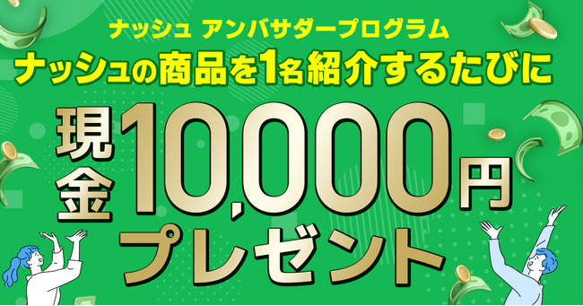 『ナッシュアンバサダープログラム』は、紹介専用のURLやQRコードからの商品ご購入につき、紹介者に3,000円の現金報酬が支払われるプログラムです。11月30日(木)までの対象期間のご紹介につきましては、サービス提供開始を記念して10,000円をお支払いします。