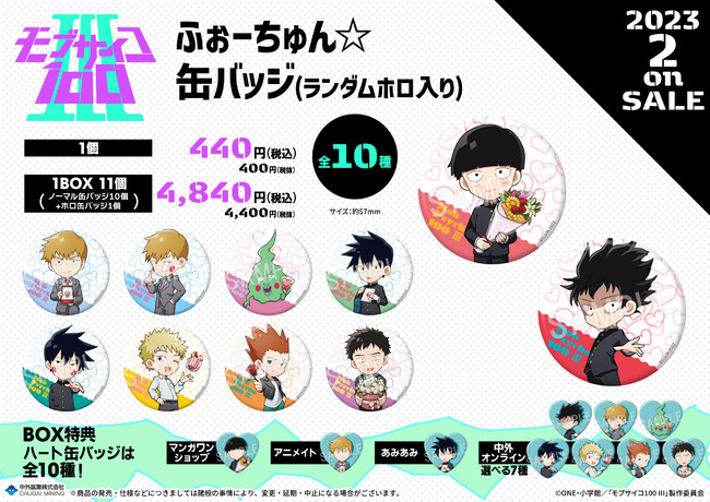 キャラクターグッズの商品企画・製作・販売を行う中外鉱業株式会社コンテンツ部は、TVアニメ『モブサイコ100 III』より「ふぉーちゅん☆缶バッジ(ランダムホロ入り)」の販売を発表いたします。2023年2月発売予定となります。