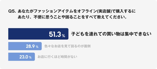 最も多かった回答は「子どもを連れての買い物は集中できない(51.3%)」で、過半数のママが子どもを連れて外で買い物をするということに不便さを感じていることが分かりました。続いて、「色々なお店を見て回るのが面倒(28.9%)」、「お店に行くほどの時間がない(23.0%)」という結果でした。これらの結果から、ママたちはファッションアイテムを実店舗で購入する際、色々なお店を比較して選びたいものの、そもそもお店に行く時間を確保することが難しいという忙しい実状がうかがえます。