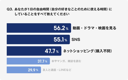 1日の自由時間にしていることトップ3は「動画・ドラマ・映画を観る」「SNS」「ネットショッピング」