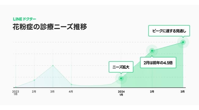 LINEヘルスケア株式会社は、オンライン診療「LINEドクター」において、例年よりも早い花粉の飛散開始による花粉症診療の高い需要等を受け、2023年12月より2024年2月の3か月連続で過去最多の診療件数を記録し、2024年2月は昨年と比較して約2倍に伸長しました。また、花粉症の診療件数は2024年2月に診療件数全体の約3割に拡大し、「LINEドクター」を含むオンライン診療が花粉症への有効な対策手段として定着しつつあることが伺えます。