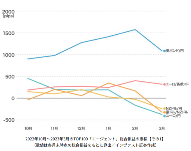 2022年10月~2023年3月のTOP100「エージェント」総合損益では、英ポンド/円がトップでした。3月に大きく損を出したものの、これまでのプラスがカバーしています。不調になったかどうかはまだ分かりませんが、注目しておきたい通貨ペアといえるでしょう。