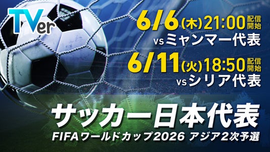 民放公式テレビ配信サービス「TVer(ティーバー)」は、『FIFAワールドカップ26アジア2次予選』の2024年6月6日(木)ミャンマー代表戦、6月11日(火)シリア代表戦を無料ライブ配信します。