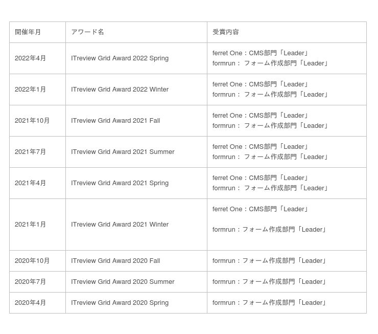 ferret Oneは、「成果などを把握できるツールとCMSが一体になっているので、着地点を想定しながらのサイト制作から運用までをワンストップでやっていくことが出来るのはとても分かりやすい。」などとユーザーから評価をいただいており、「CMSカテゴリー」でのLeaderの受賞は、前回に続き6期連続となります。