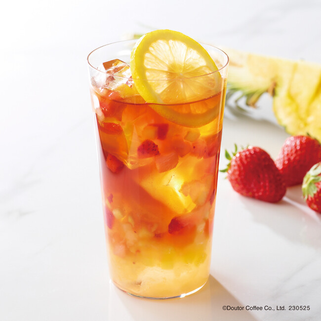 ごろごろ入ったフルーツと果肉入りピーチソースの甘味を楽しめるティードリンクです。