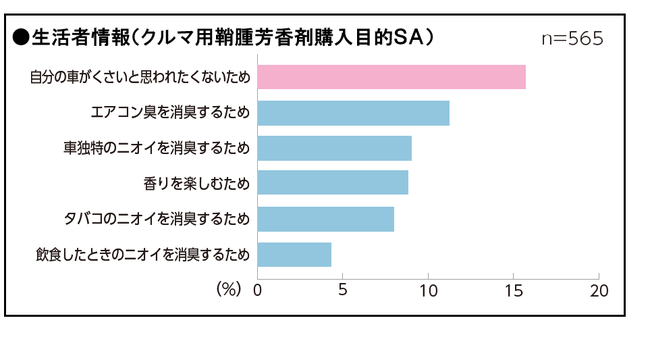 ニオイの主な原因は汗や体臭のニオイです。車用消臭芳香剤の購入者の目的にも、「自分の車がくさいと思われたくないため」が最も多く(図2)、同乗者にニオイを感じさせることに不安を感じる車内ならではの“臭いストレス”があります。