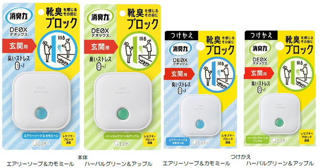 エステー株式会社は、〔レセプターブロック消臭〕機能を採用し、トイレ用で好評を博している「消臭力 DEOX(デオックス)」に、玄関の靴のニオイをブロックする「消臭力 DEOX(デオックス) 玄関用」と「つけかえ」(各2タイプ)、さらに車内の汗・体臭をブロックする「消臭力 DEOX(デオックス) クルマ用」と「つけかえ」(各2タイプ)を4月1日からそれぞれ全国のスーパー、ドラッグストア、ホームセンター、カー用品専門店(クルマ用)などで一斉に新発売します。