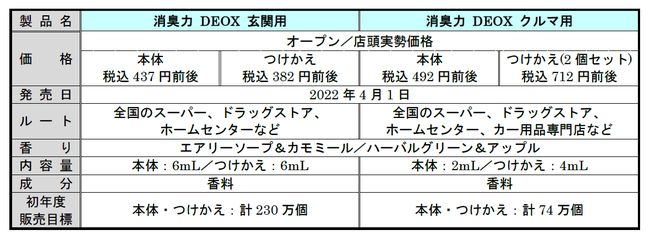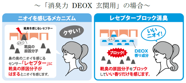 こうした生活者の“臭いストレス”を解消すべく、「玄関用」では靴や足のニオイ、「クルマ用」では汗や体臭のニオイを〔レセプターブロック消臭〕によって、“臭いストレスゼロ”へと変えていく「消臭力DEOX」を開発しました。