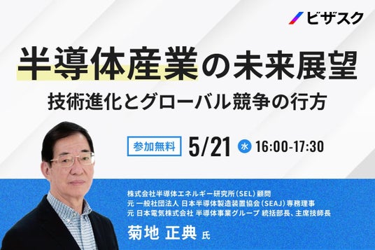 「知見と、挑戦をつなぐ」をミッションにグローバルなナレッジプラットフォームを運営する株式会社ビザスク(以下、当社)は、「半導体産業の未来展望」をテーマに、株式会社半導体エネルギー研究所(SEL)顧問、元 一般社団法人 日本半導体製造装置協会(SEAJ)専務理事、元 日本電気株式会社 半導体事業グループ 統括部長、主席技師長 菊地 正典 氏ご登壇による無料オンラインセミナーを 5/21(水)16時より開催します。
