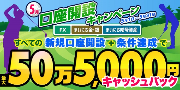株式会社 マネーパートナーズ(代表取締役社長:福島秀治、本社:東京都港区、以下「当社」)は、2023年5月の新規口座開設者向けキャンペーンとして、『FX(外国為替証拠金取引)、まいにち金・銀(商品CFD取引)、まいにち暗号資産(暗号資産CFD取引)』新規口座開設と条件達成で最大505,000円をキャッシュバックするキャンペーンを実施いたします。