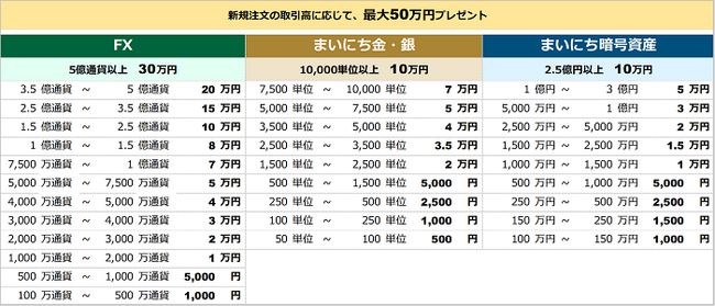 FX(パートナーズFX、パートナーズFXnano)、の新規注文の取引高に応じて最大30万円、まいにち金・銀、まいにち暗号資産の各新規お取引に応じてそれぞれ最大10万円、合計で最大50万円キャッシュバックいたします。