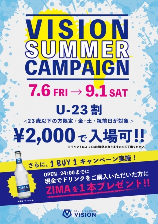 7月6日(金)~9月1日(土)の間、サマーキャンペーン・U-23割を実施いたします。期間中、金・土・祝前日に開催されるイベントにつきまして、23歳以下のお客さんは2000円で入場可能となります。