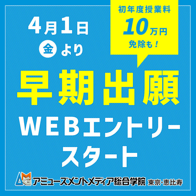 エンタメ業界のプロを育成するアミューズメントメディア総合学院(東京都渋谷区、理事長:吉田 尚剛、以下AMG)は、2022年4月1日(金)より、2023年4月入学向けの早期出願エントリーを開始いたしました。エンタテインメント業界で活躍したいと願う熱意と目標があり、すでに進路を決めているという方に向けた入試制度です。