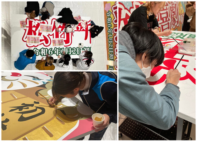12作目となる本作では、2024年1月2日(火)に南座で初日を迎える「初笑い! 松竹新喜劇 新春お年玉公演」の一文字看板を制作(サイズ:幅10.3m×高さ1.45m)しています。