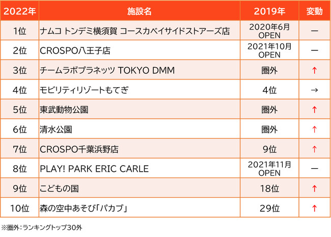 4位には、2022年3月に「ツインリンクもてぎ」から名称を変更した「モビリティリゾートもてぎ」が、関東では2019年から唯一の連続トップ10入り。人気の水遊び場「アクアベンチャー」が2022年7月にリニューアルオープンした「清水公園」も6位に着けています。
