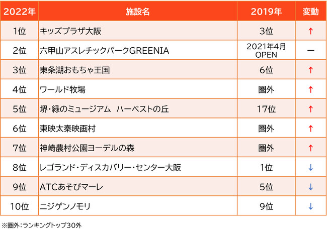 そのほか、4位「ワールド牧場」、5位「東映太秦映画村」、7位「神崎農村公園ヨーデルの森」が圏外(トップ30外)からランクイン。「堺・緑のミュージアム ハーベストの丘」も2019年17位から5位にジャンプアップしました。