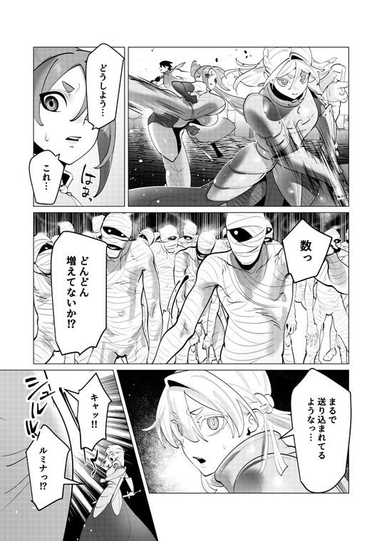 宝具・聖技の兜を手に入れるためダンジョンへと挑むクロエ一行。そこに宝具を狙う大魔王軍四天王のひとり、人妻デュラハンのエディーンが襲来する。その魔力に圧される一行だったが、クロエはダンジョンの攻略勝負を提案する。競う事が好きなエディーンはその提案に乗るのであった。「魔王軍が勝利すればクロエの持つ全ての宝具 を渡す」、「クロエ達が勝利すればエディーンはクロエの言う事を1つ聞く」という条件の中、ダンジョン攻略が今はじまる!