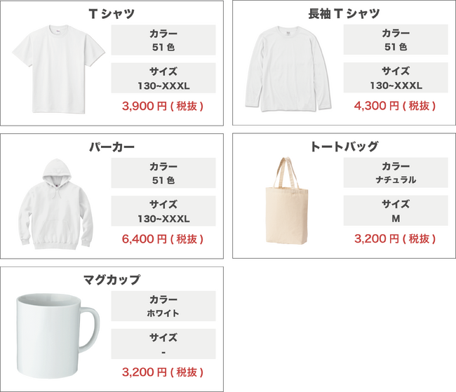 価格 :Tシャツ1枚1,100円(税込み)から ※プリント代込み、100枚以上まとめて割適用