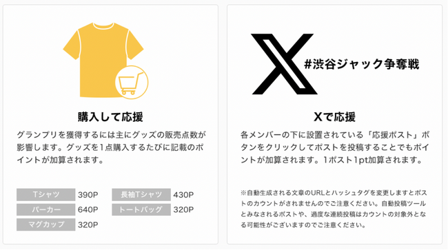 VTuberイベント「渋谷をジャックせよ!2 in MAGNET by SHIBUYA109」とオリジナルグッズ作成の「UP-T」のコラボレーションで開催されます。このイベントでは、80名を超えるVTuberが参加し、それぞれグッズをデザインして販売します。販売とポスト応援によりポイントが加算され、最も多くのポイントを獲得した参加者がグランプリに輝きます。上位入賞者は渋谷のヴィジョンへの出演権が与えられ、渋谷をジャックせよ!2のアンバサダーとして出演するチャンスも!皆さんの応援が、推しをグランプリに輝かせる鍵になります!