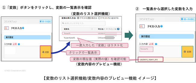 コマンド毎に詳細設定が可能なコマンドオプションでは、日付や時間、数値データなど特定の値と連動する変数への対応を強化し、一度使用した変数をリスト化し他のコマンドでも繰り返し引用しやすくする「変数のリスト選択機能」や変数の現在値を確認できる「変数内容のプレビュー機能」の追加により、変数の活用を簡易化し作業効率の向上を支援します。
