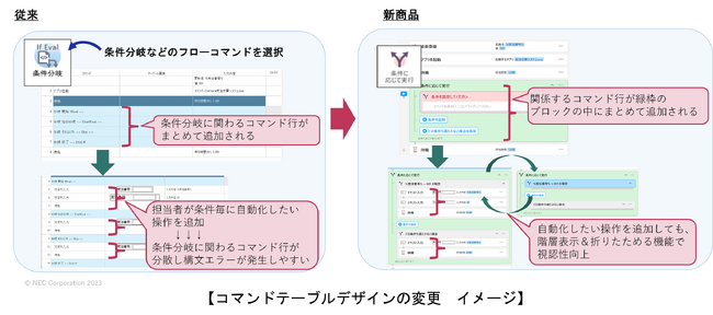 さらに、各コマンドの名称・アイコンを直感的に理解しやすい表現やデザインに変更しました。コマンドテーブルでは、フローコマンドを記録する際に必要となる構文の表示形式を一覧型から折りたたみ表示が可能な階層型へデザインを変更することで操作性と視認性を向上し、フローコマンドの設定や確認作業を簡易化しました。