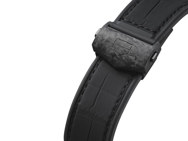 ストラップはマットブラックのアリゲーターレザーに、ラバーのライニングが施されています。サンドブラスト仕上げのグレード2チタン製フォールディングクラスプには、ダブルセーフティボタンが備えられ、タグ・ホイヤーのシールドがあしらわれています。