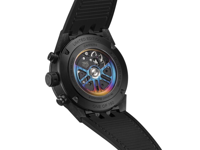 本モデルは45mmは、特徴的なケース、ベゼル、ストラップのデザインが採用されています。サテン仕上げを施したブラックPVD加工のグレード5チタン製の超軽量で耐久性に優れたオールブラックのケースは、固定式カーボンタキメーターベゼルを備えています。また、無反射防止と面取り加工のドーム型サファイアクリスタル、ブラックPVD加工のグレード5チタン製リューズとプッシュボタン、限定モデルを示すシリアルナンバーXXX/150の特別な刻印が入ったブラックPVDグレード5チタン製サファイアケースバックを装備しています。