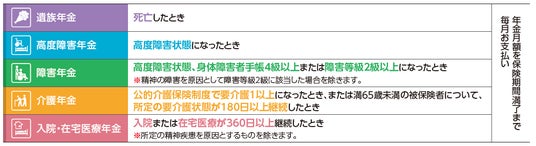 - 身体障害者手帳4級以上、要介護1以上、360日以上の入院・在宅医療等の幅広い保障範囲で年金をお支払いします。