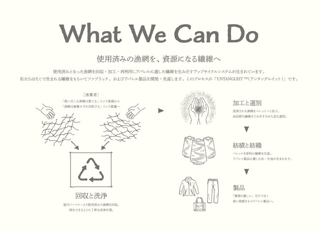 コンパクトに着こなせる、丈の短いブルゾンです。ウエスト紐を調節することで、シルエットの変化も楽しめます。素材には漁網を回収しリサイクルした素材「UNTANGLE IT ™(アンタングル)」を採用。使用済の漁網を加工・選別してアパレル製品に適した繊維にし、その繊維を活用することで環境に配慮した製品になっています。