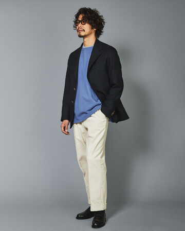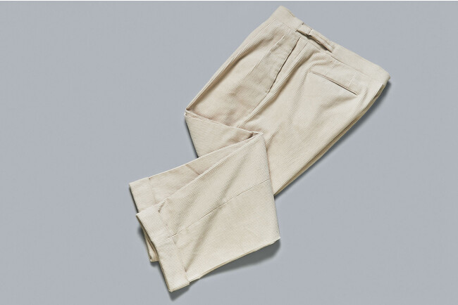 「ダークトーンが多くなり、洋服のボリューム感も増える冬の服装は、重苦しい印象に傾きがち。そこでお洒落上級者は、冬にあえてホワイトデニムなどを合わせたりするわけですが、寒々しく見えないよう計算する必要があるため、当然コーディネートの難度は高くなります。そんなジレンマを、オフ白コーデュロイなら解決できるのでは……そう考えたことも本作を企画するきっかけになりました。コーデュロイという秋冬らしい温かみを備えた素材でありながら、オフ白のトーンによって軽快さも演出できる。そんな塩梅が、大人の余裕や上品さを醸し出すのにぴったりだと思っています」 (四方さん)