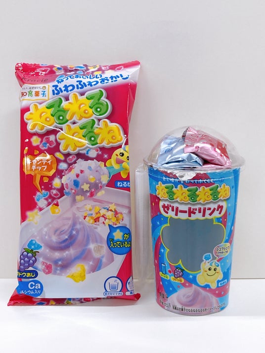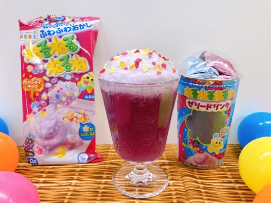 「ねるねるねるねゼリードリンク」は、ソーダ風味のゼリーを楽しんだ後、付属の粉「ねるねるのもと」を入れて混ぜると、色も変わってふくらんでブドウ味に変化し、さらにもう1つの粉「シュワシュワパウダー」も入れるとシュワシュワ感が楽しめる、飲んで楽しい・見て楽しいドリンクです。