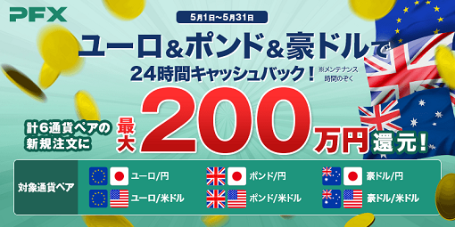 株式会社 マネーパートナーズ(代表取締役社長:福島秀治、本社:東京都港区)では、5月1日よりパートナーズFXで取扱いのある「ポンド/円・ポンド/米ドル・ユーロ/円・ユーロ/米ドル・豪ドル/円・豪ドル/米ドル」の6通貨ペアでのお取引に対し、新規お取引数量に応じて最大200万円キャッシュバックをするキャンペーンを実施いたします。