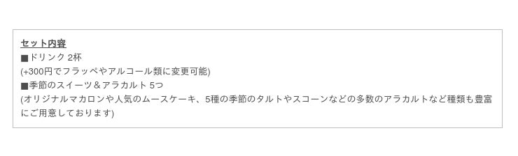 セット内容はドリンク2杯、お好きなスイーツ・アラカルト5種。おふたりでシェアしたり、おひとりさまにもお楽しみいただけるおすすめのサイズとなっております。