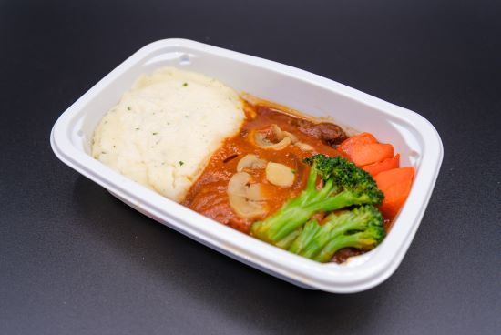 機内食でも人気のメニューで、機内食レシピをもとに、炒めた国産牛をデミグラスソースで煮込んでおります。芳醇な味わいをお楽しみください。