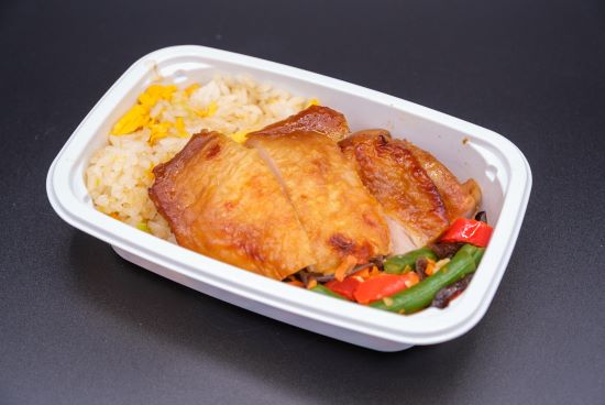 甜面醤に香辛料と甘味噌をブレンドしたホイシンソースにチキンを漬け込み、色よく焼き上げました。中華醤油で仕上げた炒飯と一緒にお召し上がりください。