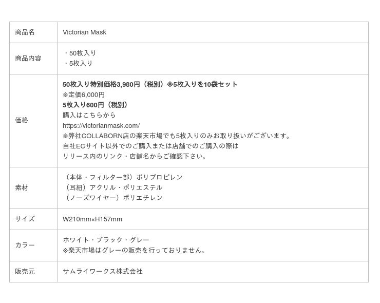 サムライワークス株式会社(代表取締役社長:新島 実 本社所在地:東京都渋谷区)はこの度、今までにない3段の新形状と4層構造のWフィルターを搭載し、更にファッション性も両立できる「Victorian Mask」を50枚入り特別価格3,980円(税抜)で販売しており、今回、朝の情報番組 TBSテレビ「グッとラック!」をはじめ、「羽鳥慎一モーニングショー」「めざましテレビ」「とくダネ!」「スッキリ」で放送されたことで多くのお客様からご注文が殺到しており、この度追加販売を実施することを決定いたしました。