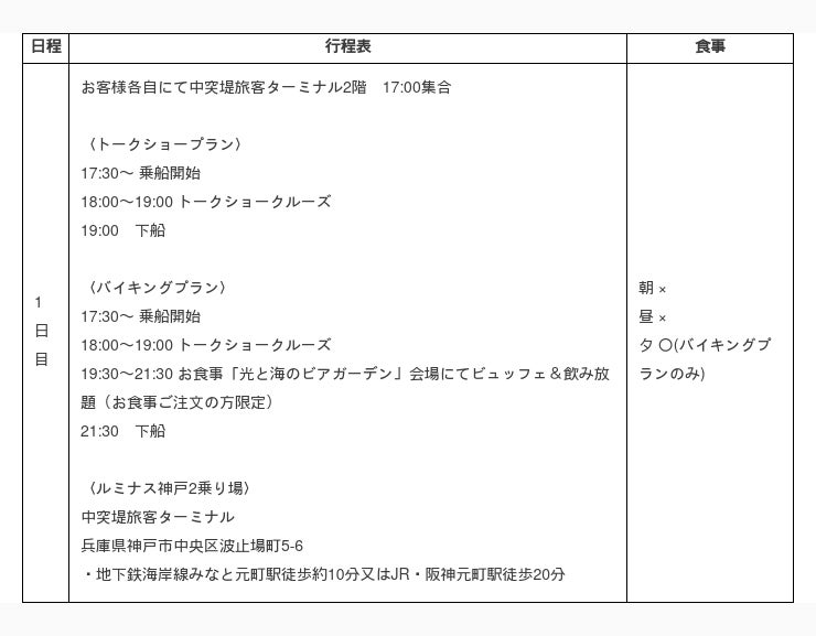 ※17:50までに必ず「ルミナス神戸2」にご乗船ください。時間に遅れますとご参加いただけない場合がございます。 ※トークショーのみのA・B席の方は19:00下船となります ※18:00~19:00、20:00~21:00はクルージングタイムとなり、乗下船ができませんのでご注意ください。