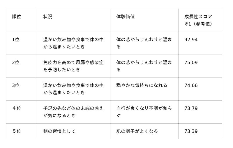 温かい飲み物や食事で体の中から温まりたいと考える生活者が、その体験を通じて体の芯からじんわりと温まると感じるケースが、最も成長している分野として1位にランクインしました。2025年の温活では、何かの目的のための手段ではなく、「温まる体験そのもの」が価値として認識されていることが判明しました。